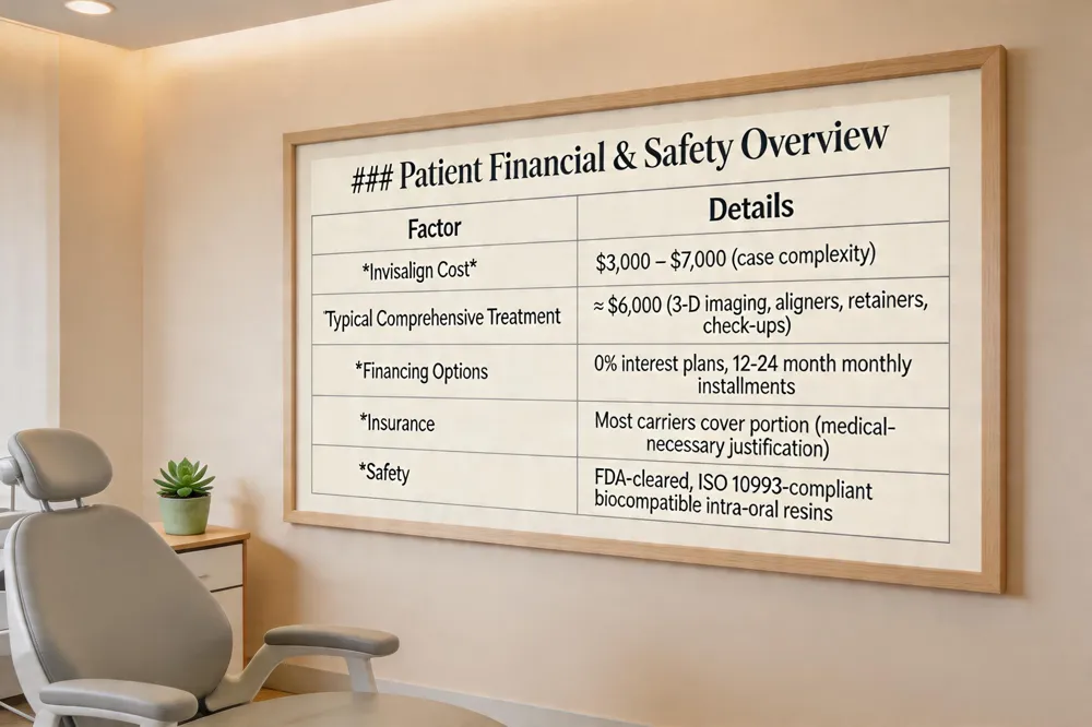 | Typical Comprehensive Treatment | ≈ $6,000 (includes 3‑D imaging, aligners, retainers, check‑ups) |
