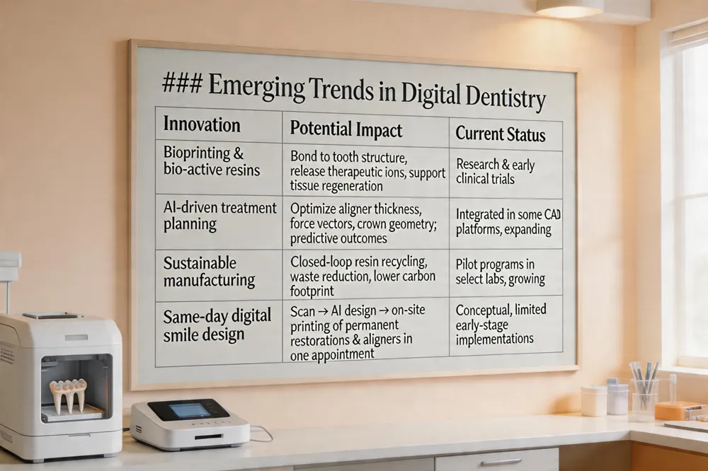 The next wave of dental 3D printing will hinge on new biocompatible and bio‑active resins that can bond to tooth structure, release therapeutic ions, and even support tissue regeneration, moving beyond current composite or ceramic‑filled polymers. AI‑driven treatment planning is already reshaping workflows—integrating intra‑oral scans, CBCT data, and predictive models to optimize aligner thickness, force vectors, and crown geometry for faster, more precise outcomes. Sustainable manufacturing is becoming a priority: additive processes waste only the material needed, and emerging recycling loops for resin and support structures further cut landfill impact, aligning with environmentally conscious practices. Together, these advances promise a fully digital, same‑day smile design platform where a patient’s scan drives AI‑generated designs that are printed on‑site in biocompatible, bio‑active materials, delivering permanent restorations and orthodontic appliances in a single appointment.