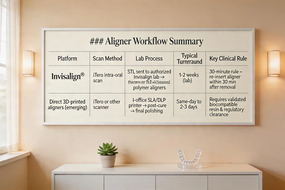 | Direct 3D‑printed aligners (emerging) | iTero or other scanner | In‑office SLA/DLP printer → post‑cure → final polishing | Same‑day to 2‑3 days | Requires validated biocompatible resin & regulatory clearance |