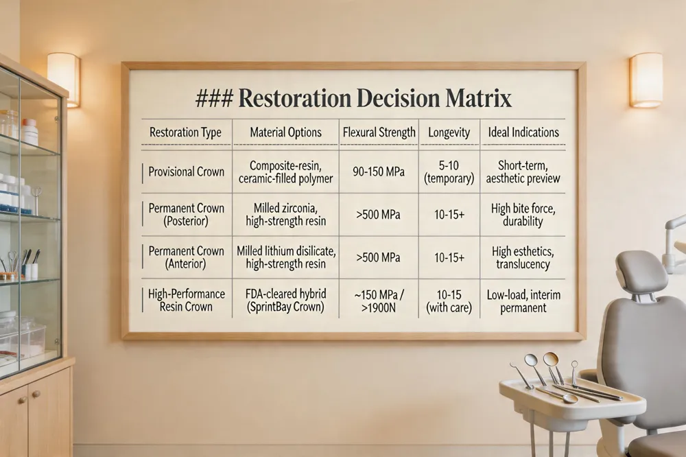 | Permanent Crown (Posterior) | Milled zirconia, high‑strength resin | >500 | 10‑15+ | High bite force, durability needed |