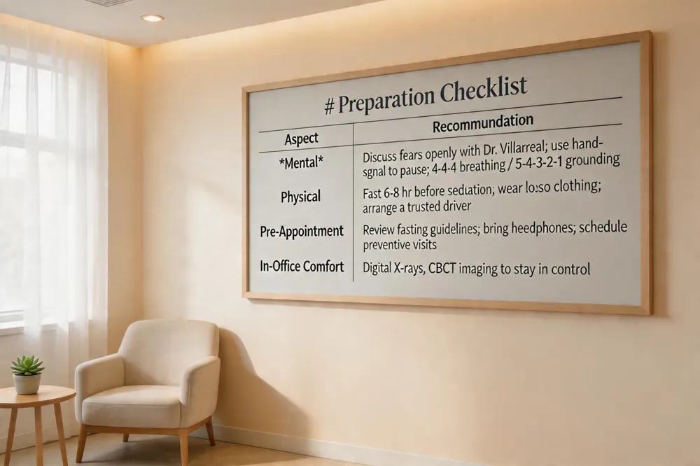 Start by speaking openly with Dr. Villarreal and the dental team. Share any past experiences, specific fears, or triggers; the staff will explain each step, offer a hand‑signal to pause treatment, and suggest the most appropriate sedation option.