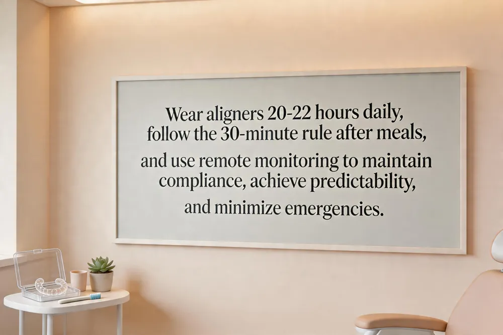 Invisalign patients must wear aligners 20‑22 hours daily; the 30‑minute rule advises reinserting trays within half an hour after meals to keep enamel protected and maintain continuous pressure. Speech may be slightly altered initially, but most users adapt within days as the smooth SmartTrack™ material reduces irritation compared with brackets. Remote monitoring platforms (e.g., Dental Monitoring) let clinicians review weekly photos, decreasing in‑person visits while ensuring the treatment stays on track. Compliance is critical—missed wear time can slow tooth movement and compromise results, while diligent use yields predictable outcomes and fewer emergency visits.