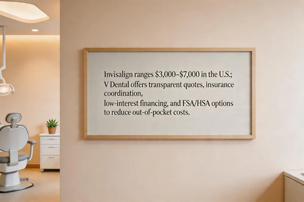 In the United States Invisalign typically costs $3,000–$7,000, with $3,000 at the low end for simple cases and $6,000 common for moderate‑to‑complex corrections. Prices rise with case complexity, number of trays, and the high‑tech workflow—iTero 3‑D scans, CBCT imaging, SmartTrack material, and customized digital treatment planning—all of which V Dental in Live Oak, Texas incorporates for precise, predictable results. Most dental plans cover up to $3,000 of orthodontic care, and V Dental offers low‑interest financing, interest‑free plans, and FSA/HSA options to spread out the expense. Generic clear‑aligner kits start around $2,000 but lack Invisalign’s patented materials and professional oversight; traditional metal braces run $2,500–$5,000, often with more office visits. At V Dental you receive a transparent, individualized quote after a comprehensive exam and digital scan, ensuring you know exactly what’s included and how insurance or financing can lower out‑of‑pocket costs.