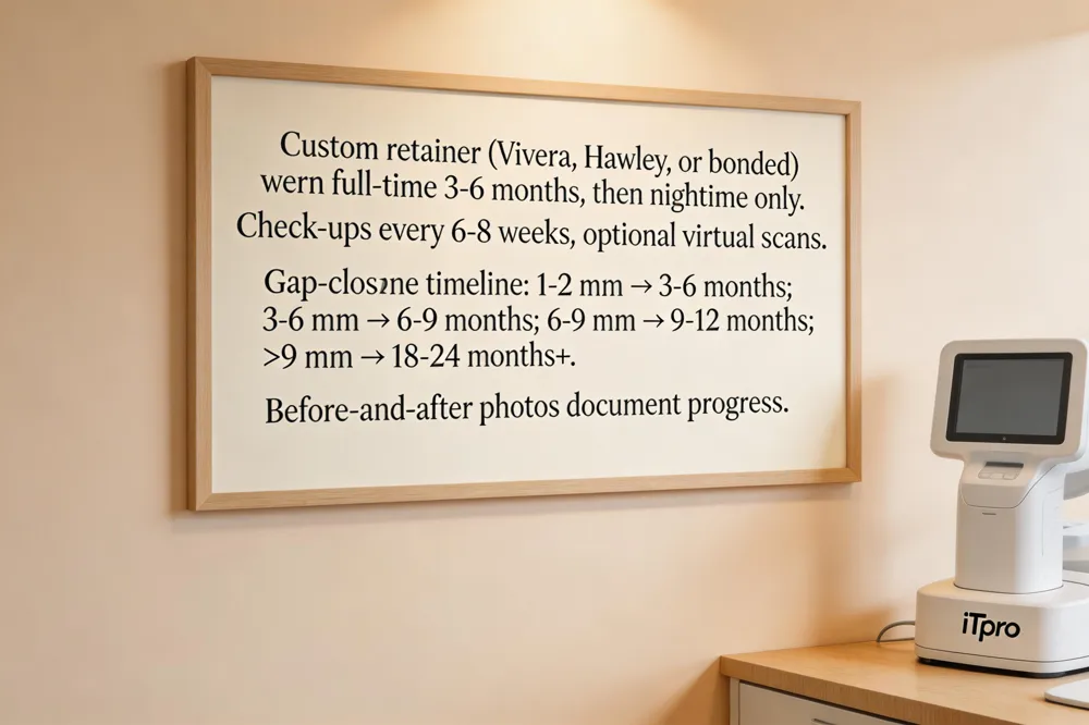 How long does Invisalign take for gaps? Small 1‑2 mm gaps close in 3‑6 months; moderate 3‑6 mm gaps need 6‑9 months; larger 6‑9 mm gaps take 9‑12 months; very wide spaces over 9 mm may require 18‑24 months or more. Consistent 20‑22 hour wear is essential.