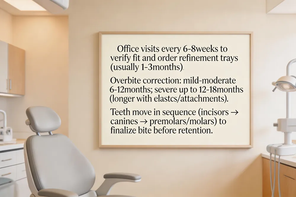 During Phase 3 you visit the office every 6‑8 weeks for a quick check‑up. Dr. Brandon Villarreal reviews the digital scan, confirms that each aligner is fitting correctly, and orders any refinement trays needed. Refinement is the final set of custom aligners—usually 1–3 months long—that fine‑tune any remaining gaps, rotations, or bite issues after the original series ends. Overbite correction follows the same principle: mild to moderate overbites typically wrap up in 6–12 months, while more severe cases may require 12‑18 months (or longer if elastics or attachments are used). The treatment sequence is staged; the front incisors move first to create space, followed by canines, then premolars and molars, which finalize the bite and provide stability. Consistent wear of 20‑22 hours a day and attending all scheduled appointments keep the timeline on track and ensure a stable, aesthetically pleasing result before moving to the retention phase.