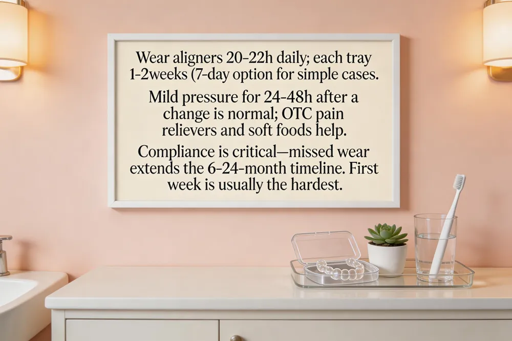 Patients must keep their aligners in for 20‑22 hours daily, removing them only for meals, water, and oral hygiene. Each tray is typically worn 1‑2 weeks; clinicians may opt for a 7‑day change on simple cases to speed progress, while the 14‑day protocol offers finer control for tougher movements. When a new tray is placed, a mild, dull pressure or soreness—similar to a dental adjustment—appears for 24‑48 hours; this is normal and indicates active tooth movement. Over‑the‑counter pain relievers, soft foods, and inserting the tray before bedtime help manage discomfort. Compliance is the single greatest factor in staying on schedule: missing wear time can extend the 6‑24‑month timeline by weeks or months.