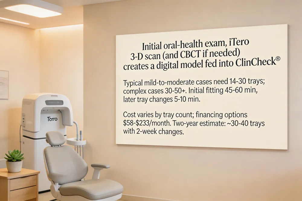 The first step at V Dental is a thorough oral‑health exam to confirm you’re a good candidate for Invisalign. Using an iTero™ 3‑D scanner (and CBCT imaging when needed) we capture a precise digital model of your teeth and bite. That data feeds ClinCheck® software, which simulates each tooth’s movement and predicts the total number of trays required. For most mild‑to‑moderate cases the count falls between 14‑30 trays; a complex case may need 30‑50+ trays, so 47 trays is high but normal for extensive corrections.