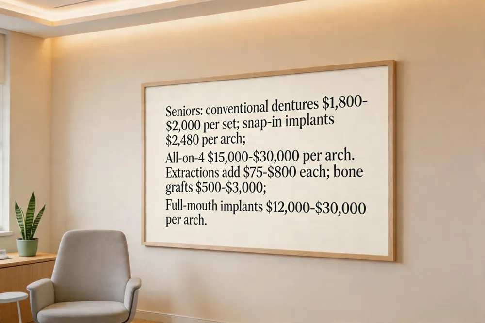 If extractions are needed before denture fabrication, the total expense rises. Conventional full dentures still cost $1,500–$5,000, but each extraction can add $75–$800, and bone‑grafting or sinus‑lift procedures—often required for implant cases—add another $500–$3,000 per site. Thus, a senior who needs several extractions may see the overall denture cost climb into the $2,500–$4,000 range, while the implant route could exceed $20,000 once surgical and restorative fees are included.