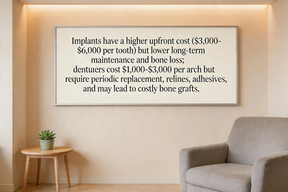 In summary, dentures offer a low‑cost entry point but generate hidden recurring expenses—adhesives, relines, periodic replacements—and may lead to costly bone loss over time. Implants require a larger upfront outlay but provide permanent, bone‑stimulating support that can offset long‑term maintenance and health‑care costs, making them a more cost‑effective solution for many patients when viewed over a 10‑ to 20‑year horizon.