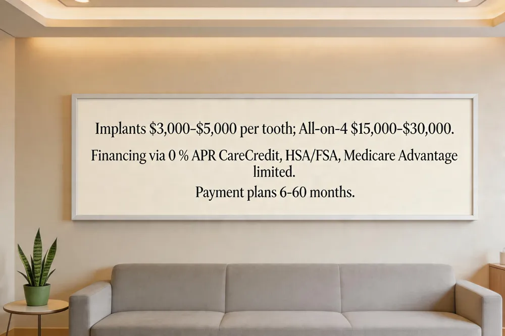 Financing options bridge the gap between upfront expense and long‑term value. Programs such as CareCredit, BNPL services, HSAs/FSAs, in‑house payment plans, and third‑party lenders allow patients to spread implant costs over 12‑36 months, many with 0% promotional APR. Denture patients can also benefit from low‑interest plans, making high‑quality, bone‑preserving solutions attainable for a broader range of budgets.