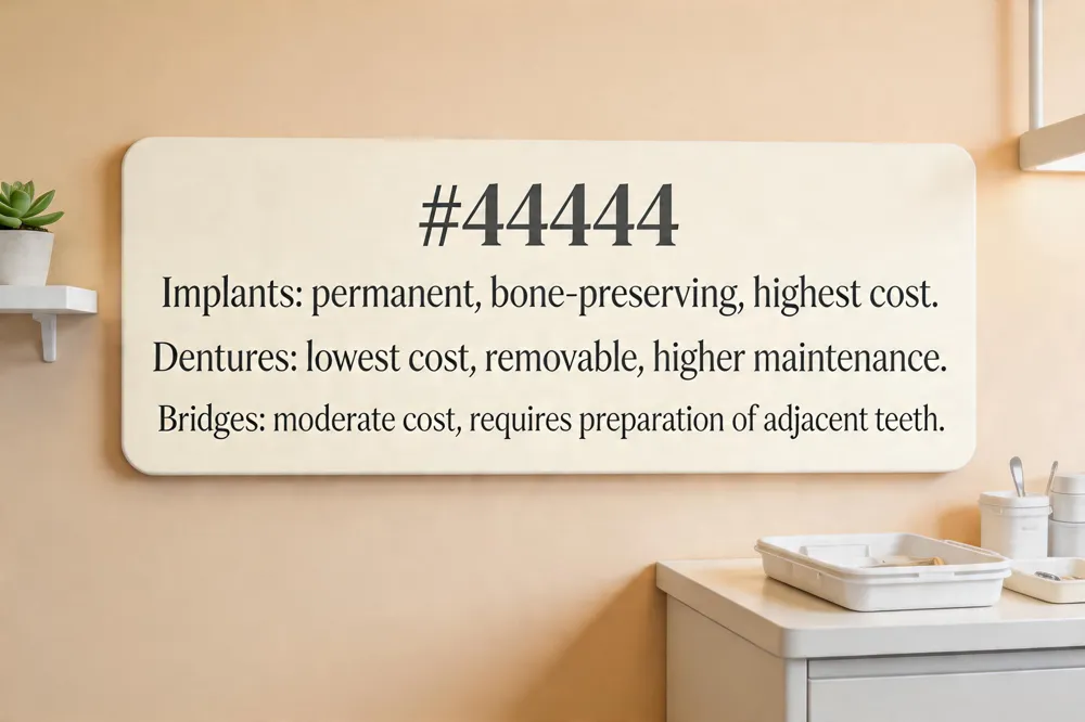 When deciding between a denture, a bridge, or an implant, it’s essential to match the treatment to the patient’s clinical situation and budget. Implant vs. denture vs. bridge – Dental implants act as artificial roots surgically placed into the jawbone, offering a permanent, bone‑preserving solution that feels and functions like a natural tooth. Dentures are removable prostheses that replace a full arch or a partial set of teeth; they are the least invasive and most affordable option but can slip, cause sore gums, and do not stimulate bone growth. A dental bridge fills a short gap by anchoring a false tooth (or multiple teeth) to the crowns of adjacent healthy teeth, requiring preparation of those teeth and offering a middle‑ground cost and stability. Implants generally deliver the most natural look, long‑term value, and comfort, while dentures are best when many teeth are missing and surgery is not desired, and bridges work well for a few consecutive missing teeth when the neighboring teeth are strong enough. Choosing among them depends on the number of missing teeth, budget, oral‑health status, and how important permanence and bone preservation are to the patient. What is the most expensive type of dentures? – Implant‑supported dentures are the cost expensive. They require surgical placement of titanium posts, advanced digital imaging, and custom‑fabricated prosthetic teeth, pushing total costs well above conventional full, partial, or temporary dentures. Snap‑on dentures vs. All‑on‑4 cost – Snap‑on (implant‑supported) dentures typically run $8,000‑$20,000 per arch, covering implants, a removable acrylic base, and attachment hardware. All‑on‑4 full‑arch solutions are higher, ranging from $18,000‑$40,000 per arch, because they use a fixed bridge supported by four strategically placed implants and often employ premium materials. Which dentures are most affordable? – The most affordable option is a basic, removable full denture, sometimes called an economy denture, which averages about $452 per arch (range $348‑$883). Standard full dentures average $1,968, while partial or metal‑based dentures can cost $1,700‑$2,300 or more.