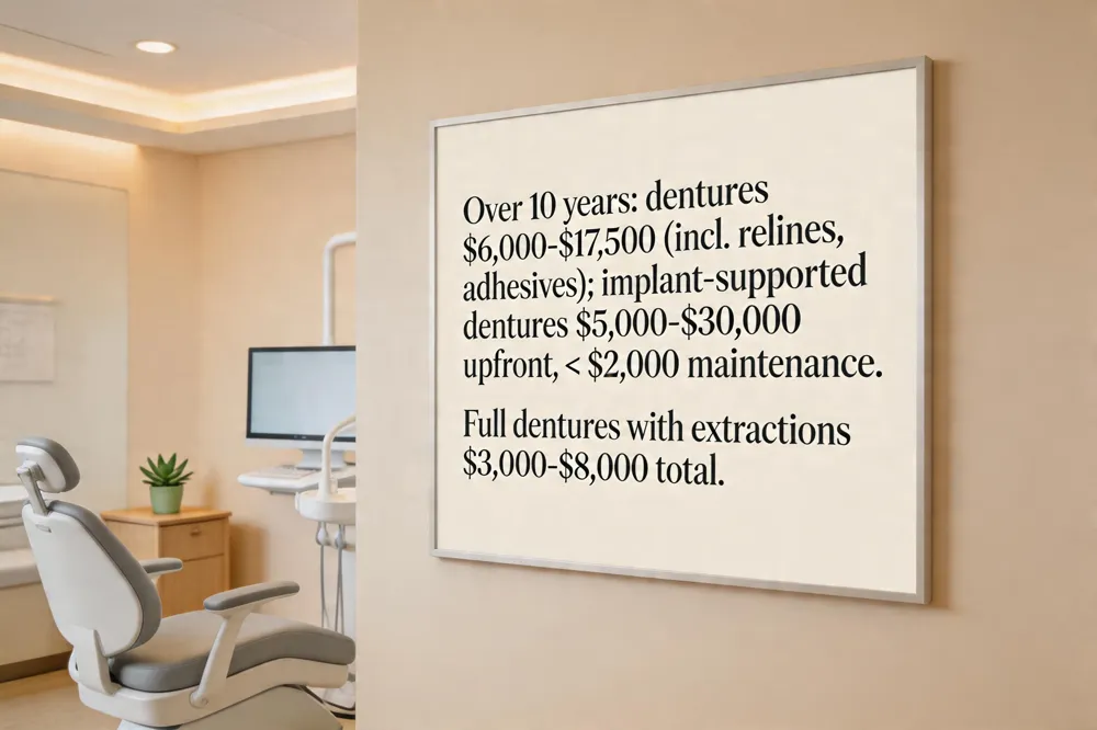 - Over a ten‑year horizon, total denture expenses—including relines, replacements, and adhesives—can reach $6,000‑$17,500.