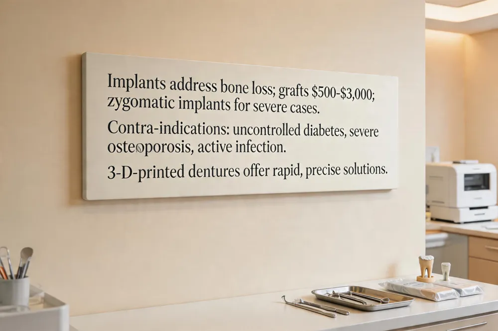 Implants for jaw bone loss remain the gold‑standard solution for patients experiencing resorption. Titanium posts stimulate the alveolar bone, preserving density and even rebuilding lost tissue through osseointegration. When native bone is insufficient, grafting procedures—often costing $500‑$3,000—can regenerate the area, and in extreme upper‑jaw cases zygomatic implants anchor into the cheekbone, bypassing the deficient jaw entirely. Implant‑supported overdentures also restore a stable bite while continuing the bone‑preserving stimulus.