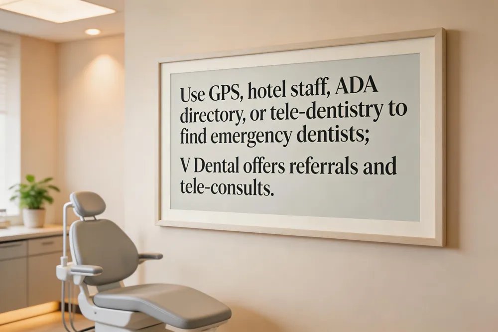 What to do if you have a dental emergency while traveling? 1️⃣ Rinse with warm water, remove debris. 2️⃣ Apply a cold compress. 3️⃣ Take an OTC pain reliever. 4️⃣ Contact V Dental (or your regular dentist) for urgent guidance or referral. 5️⃣ Seek immediate care at the nearest emergency department for severe bleeding, facial swelling, or a knocked‑out tooth.