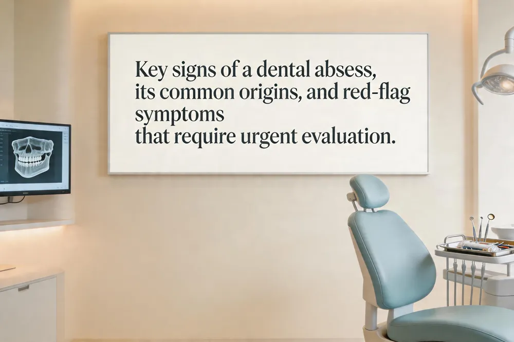 A dental abscess is a localized collection of pus that forms when bacteria invade the tooth pulp, root tip, or surrounding gum tissue. Early detection is crucial because the infection can spread rapidly to the jawbone, sinuses, or even the bloodstream, leading to severe complications such as cellulitis, osteomyelitis, or sepsis. Recognizing the warning signs helps prevent these outcomes. Typical symptoms include a constant, throbbing toothache that may radiate to the jaw, ear, or neck; swelling of the gums, cheek, or face; a foul taste or bad breath; fever; and tender, enlarged lymph nodes. Prompt dental evaluation and treatment can preserve the tooth and protect overall health. Professional care involves drainage, antibiotics, and a root‑canal or extraction to eliminate infection.