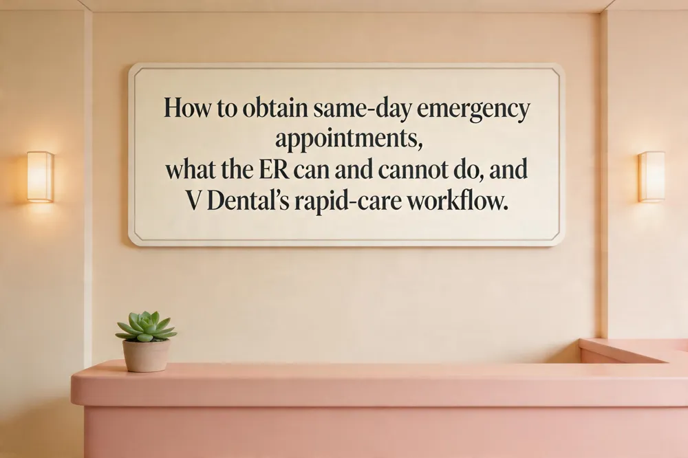 What do I do if I have a dental emergency and no dentist?: Call V Dental’s emergency line for guidance and a same‑day slot. If unreachable, go to the nearest urgent‑care center or ER for pain control and antibiotics, rinse with warm salt water, apply a cold compress, and keep any knocked‑out tooth moist in milk or saliva. Promptly schedule a definitive appointment with V Dental.