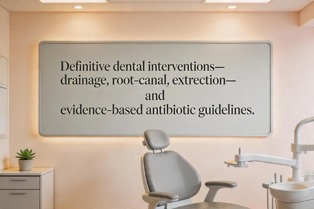 A dental abscess requires definitive treatment beyond home relief. Dental drainage and root‑canal procedures are the cornerstone: the pus is incised and drained, then the infected pulp is removed and the canals are cleaned, shaped, and sealed in a root‑canal; if the tooth cannot be saved, extraction is performed. Antibiotic selection and guidelines dictate that antibiotics are prescribed only when the infection is severe, spreading, or the patient has systemic involvement. First‑line therapy is amoxicillin (or amoxicillin‑clavulanate) to cover the usual oral flora; clindamycin or azithromycin are alternatives for penicillin‑allergic patients, and metronidazole may be added for anaerobes. Patients must complete the full course and follow up promptly for definitive dental care.