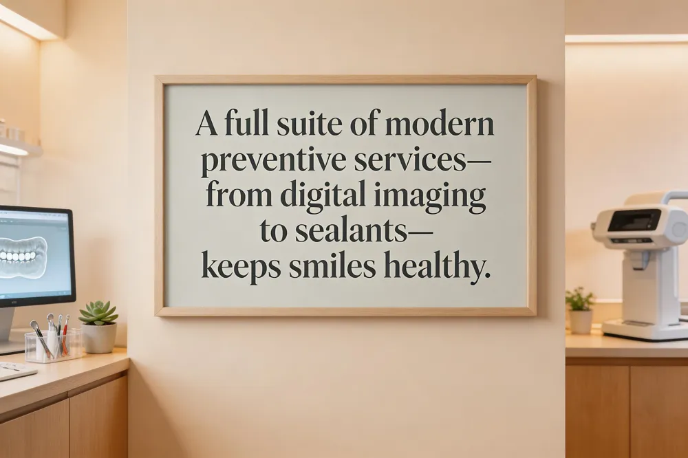 List of preventive dental services: Regular exams, digital X‑rays, CBCT scans, professional cleanings, fluoride treatments, sealants, oral‑cancer screenings, personalized hygiene instruction, nutrition counseling, and, for children, space maintainers or preventive resin restorations.